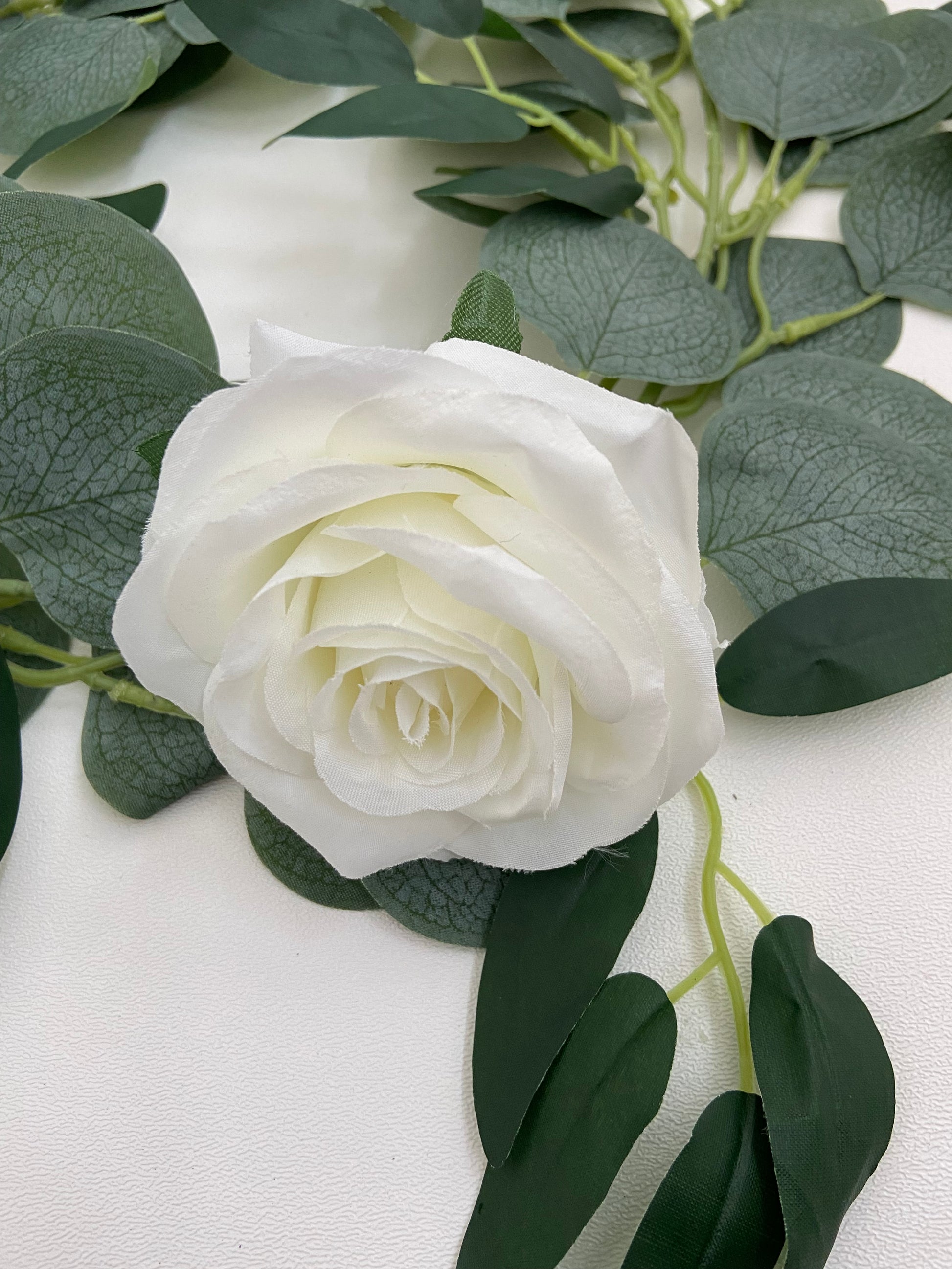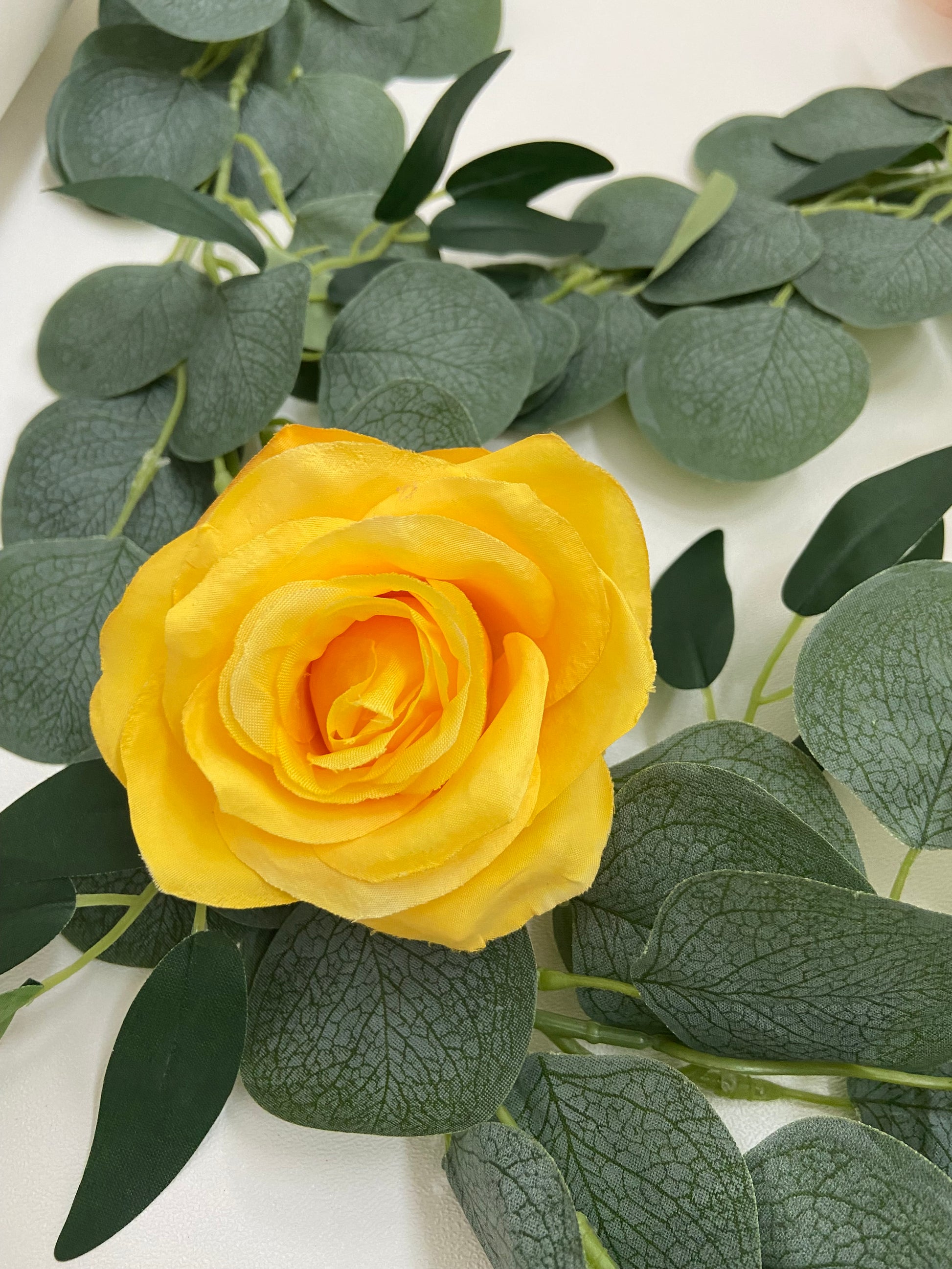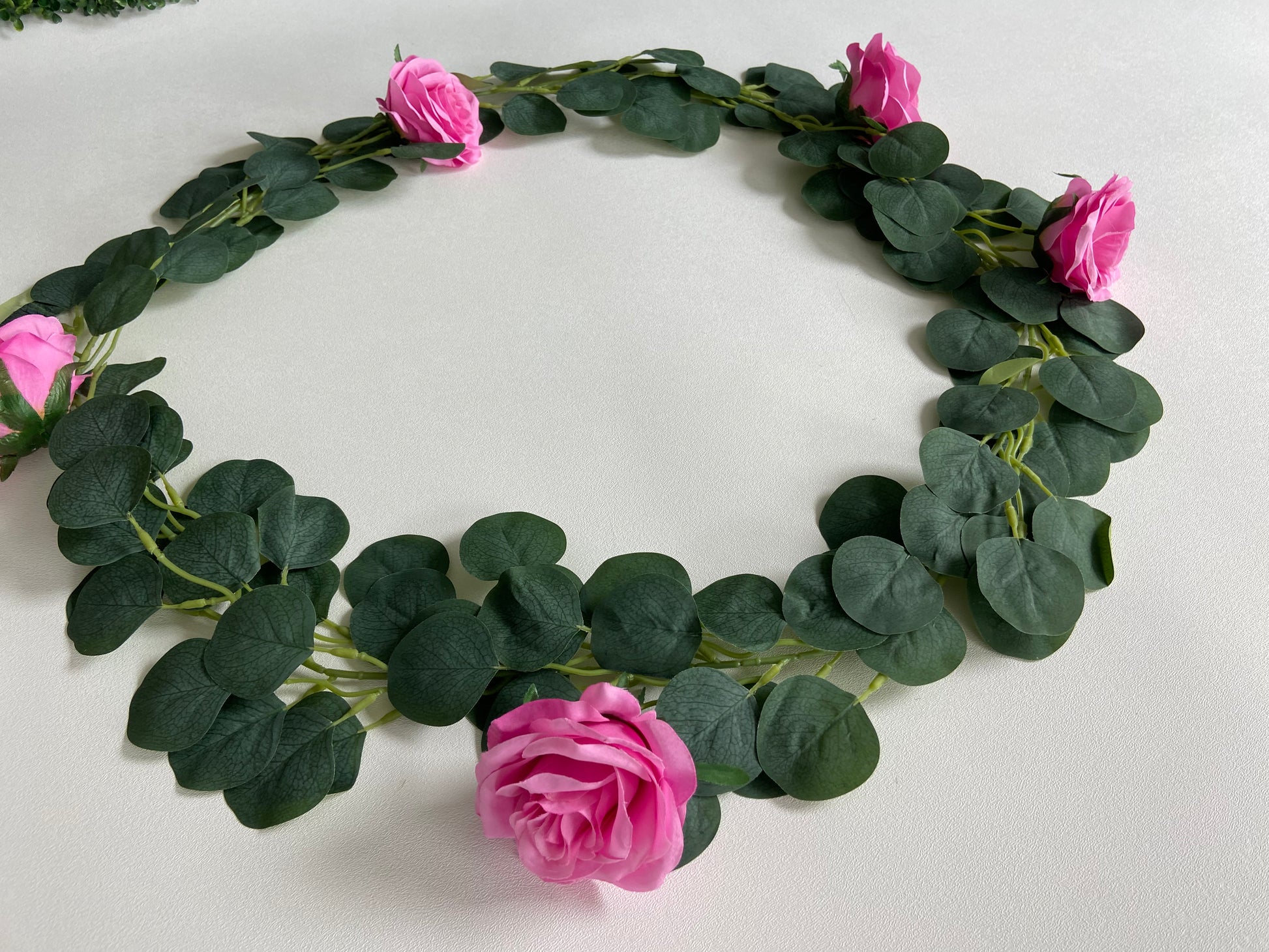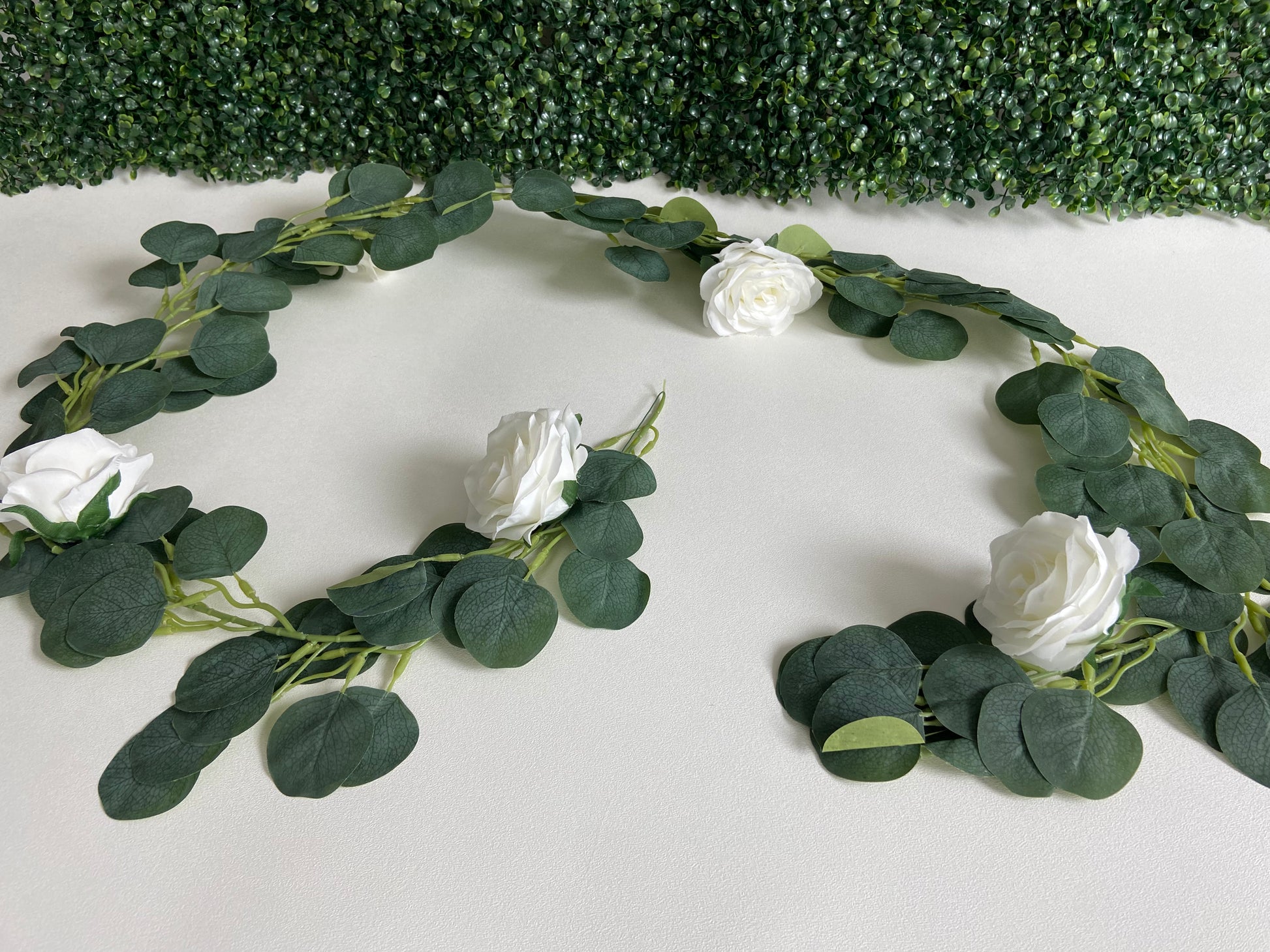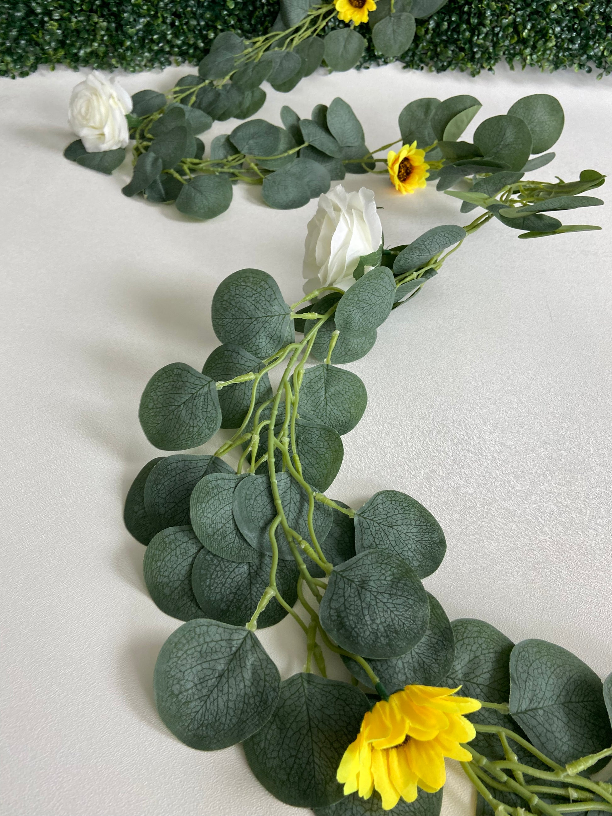 Enhance the natural beauty of your event with our lifelike eucalyptus garlands. These artificial vines are meticulously crafted with silk leaves and durable plastic vines, providing a realistic and long-lasting foliage option for your decor needs. Each vine stretches 6.5 ft long, adorned with lush 2.16-inch leaves, adding a touch of greenery to any space. Each silk flower measure 4 inches wide.